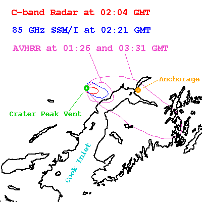 Figure 3. The extent of the August 19, 1992 Crater Peak/Spurr volcanic cloud as observed by C-band radar (5 cm), 85 GHz SSM/I (3.5 mm), and Band 4 AVHRR (10.8 um). The outline of the volcanic cloud was subjectively determined by interpolating between volcanic cloud pixels and non-volcanic cloud pixels based on volcanic cloud pixels having lower brightness temperatures than non-volcanic cloud pixels.