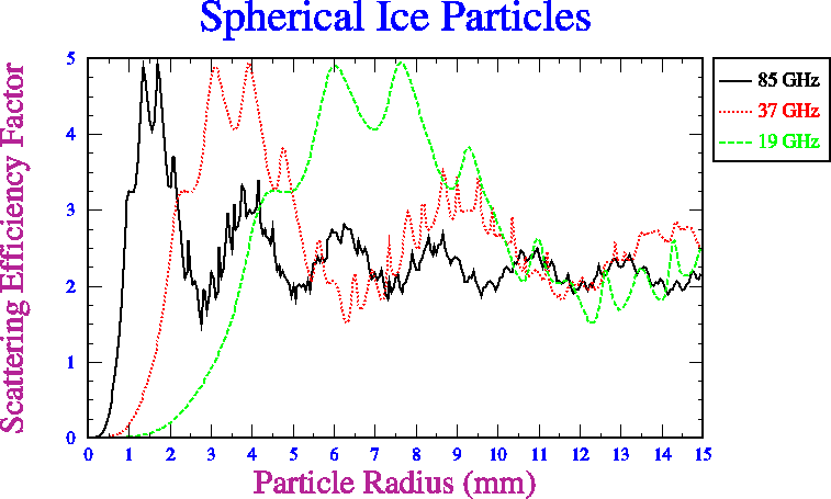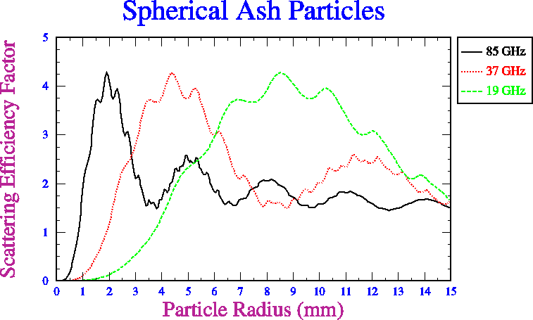 Figure 7. The scattering efficiency factor for spherical ice and ash particles as a function of radius. The index of refraction of ice [Tiuri et al., 1984] is different than the index of refraction of volcanic ash [Adams et al., 1995], which results in different scattering efficiencies for ice and ash particals.