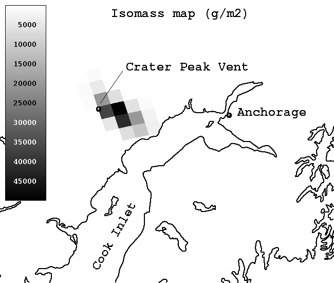 Figure 8. Isomass maps (g/m2) of the August 19, 1992 Crater Peak/Spurr volcanic cloud as estimated from SSM/I data using the modified rain fall rate equation (top) and ground sampling of the ashfall blanket (bottom) [R. G. McGimsey, personal communication]. The diffence observed between the SSM/I data and the ground sampling data may be due to a wind shear. Note that the value of the 15000 contour line is only my estimate.