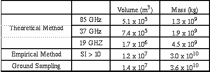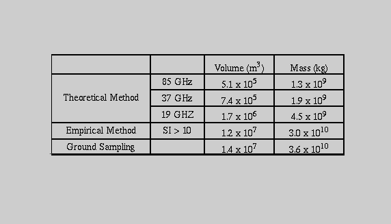 Table 1: The total volume and mass of the August 19, 1992 Crater Peak/Spurr volcanic cloud as determined by the two methods outlined in this paper. Both methods assume a constant eruption rate and that the eruption lasted for 3.5 hours. The extent of the volcanic cloud was determined by using a scattering index threshold value of 10. The theoretical method uses a lognormal particle distribution with a mean of 0.9 mm, a standard deviation of 0.74, and a particle fall out time of half an hour. The empirical method is based on a modified rainfall rate with a correction factor of 0.42. The last column lists the estimated volume and mass based on ground sampling of the ashfall blanket[Neal et al., 1995].