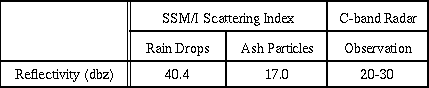 Table 2: The radar reflectivity for the center of the August 19, 1992 Crater Peak/Spurr volcanic cloud. The rainfall rate is based on stratiform rain. The ashfall rate uses a correction factor of 0.42