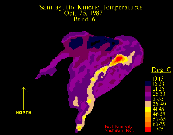 Landsat Thematic Mapper Band 6 digital number (DN) values converted to temperature values. An emisivity value of .95 was used in the modified Plank's equation. The long thermal anomaly is a long lived blocky lava flow eminating from Caliente on Santiaguito.