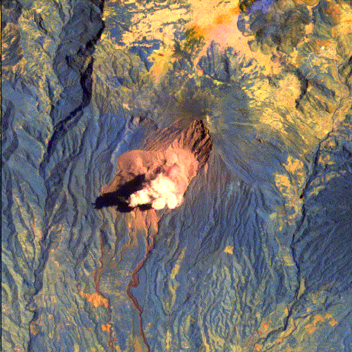 Phreatomagmatic eruption plume rising from Caliente casting a well defined shadow. Bands 754 in RGB respectively showing the thermal anomaly on the dome.