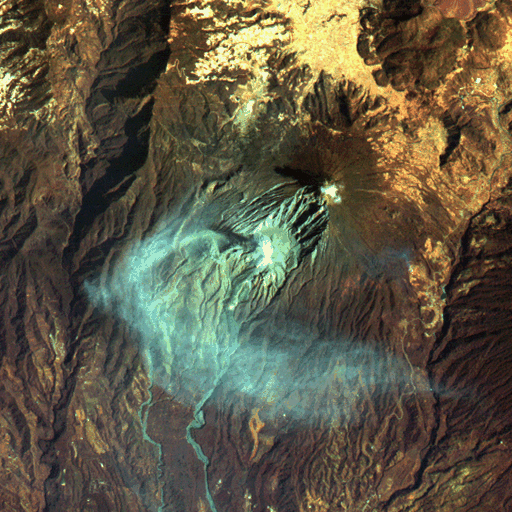 TM bands 731 displayed in the RGB respectively. This image highlights a translucent eruption cloud. Also seen in the infrared bands of this image is the long lived blocky lava flow that is observed in the October 1987 image.