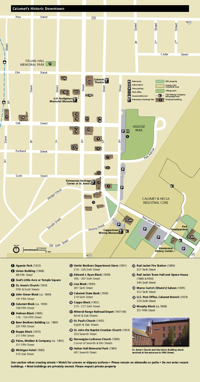 Above the C&H Conglomerate layer that dips to the NW and is largely stoped and open is the Red Jacket area which marks the core of Calumet’s downtown district. It is now a combination of partly and completely restored buildings, empty spaces where fires have occurred and destroyed former buildings, and buildings that are suffering from neglect. Overall there is a positive aspect of revival by artists, businesspeople and tourist related activities. The buildings preserve the historic character of copper boom, overprinted with its slow decline.