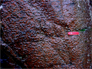 Keweenaw rift rocks include a somewhat rare textural variety of basalt called ophite or ophitic basalt. Ophitic texture is defined inconsistently, but it is an important variety of basalt texture where pyroxene (or occasionally olivine) forms larger crystals and typically contains numerous crystals of plagioclase (right). Pyroxenes may vary from < 1 to 10 cm and may include as many as hundreds of plagioclases. In the field the pyroxenes are often 1-2 cm in diameter and give the rock a distinctive aspect. There may be a brownish or orange region surrounding the pyroxenes which may represent a glassy remnant of magma melt. Overall the ophite is thought to represent a solidified remnant of a dendritic crystal mush. Crystal size and form in volcanic rocks is known to be influenced by the rates of cooling in the immediate vicinity of the growing crystal. Slow cooling in a pluton leads to large, equidimensional crystals, while very rapid cooling can lead to no crystals at all (glass or obsidian). Intermediate cooling rates can lead to unusual shapes of crystals (spherulites, “bow ties”, spinifex, and ophitic) as crystals nucleate or grow at accelerated rates as crystallization, which requires more time than allowed by the environmental cooling of the lava, cannot keep pace and exhibits disequilibrium (Lofgren, 1980). The rate of heat loss (undercooling or supercooling) during the solidification is thus thought to cause ophitic texture, where pyroxene is growing rapidly and plagioclase is forming many more nuclei. Because ophites may completely crystallize and can be coarse-grained, especially with respect to pyroxene, some are termed gabbro rather than basalt. At first geologists looking at ophitic lava flows in the Keweenaw wondered whether they were sills.