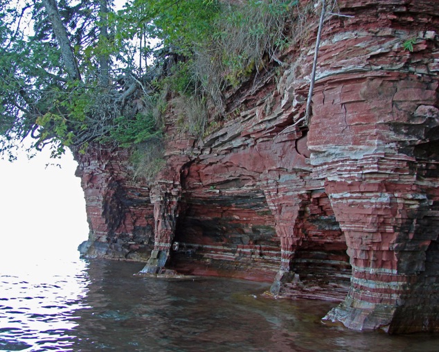 Outcroppings of the Jacobsville occur west of Chassell and farther south along the west side of Pike River, and along the west side of the Sturgeon River Valley pink areas on the map). The most dramatic exposure of the Jacobsville occur in cliffs along the shore of Keweenaw Bay, east of Klingville and Arnheim (red areas on map).
