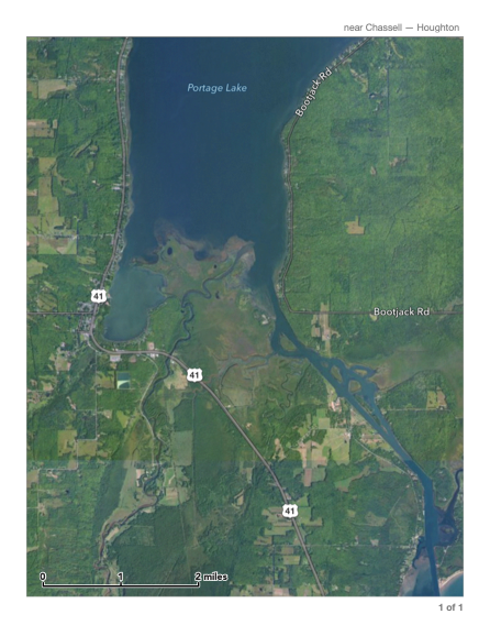 The Sturgeon River Delta (right) is a classic “birdfoot” delta, like the Mississippi River and many other examples around the world. Birdfoot Deltas form when an active river with currents carrying sediment arrives at its mouth and there is relatively calm water. In this case the calm water is Portage Lake and the delta is built from the accumulation of dropping sedimentary particles. This site could be a focus for educational geological interpretation, along with several other spots in the Township. The access to this feature, both on the surface and by boat offers educational/tourist opportunities for ecoconscious people, and an interpretive plan could be in the Township’s interest.