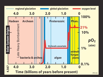 Earth’s atmosphere is likely composed of cometary materials and elements degassed from earth’s volcanoes. In the early earth there was no free oxygen and the ocean was quite reducing, but all the acids from volcanoes helped keep the ocean quite acidic. The ocean is now quite oxidized and has a pH of 8.2. Meanwhile Earth’s atmosphere was devoid of oxygen and rich in CO2. Cyanobacteria lived in those early oceans and the water shielded them from deadly ultraviolet radiation from the sun. So they grew colonies and photosynthesized, releasing free oxygen. This oxygen slowly oxidized the ocean and eventually oxidized the atmosphere also. The red color of the Jacobsville attests to oxidation as many older surficial sediments are green in color reflecting reduced iron. Note how Jacobsville time at about 1 by before present just precedes two global glaciation events, and the rapid increase in atmospheric O2.