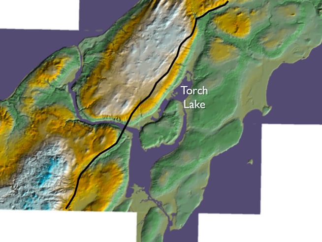 The Traprock Valley lies parallel to the Keweenaw Fault. The Traprock River is located about a half mile east of the Fault, and like the Pilgrim River, the Traprock is downcut into the softer Jacobsville, even though it location is strongly influenced by the fault. Glacial scouring was more intense into the Jacobsville, so a valley was present as the glacier withdrew. The valley fill derived from glacial deposits and post glacial lakes, much of it fine unconsolidated silts. Thus the valley is agriculturally more productive than most of the Keweenaw.
