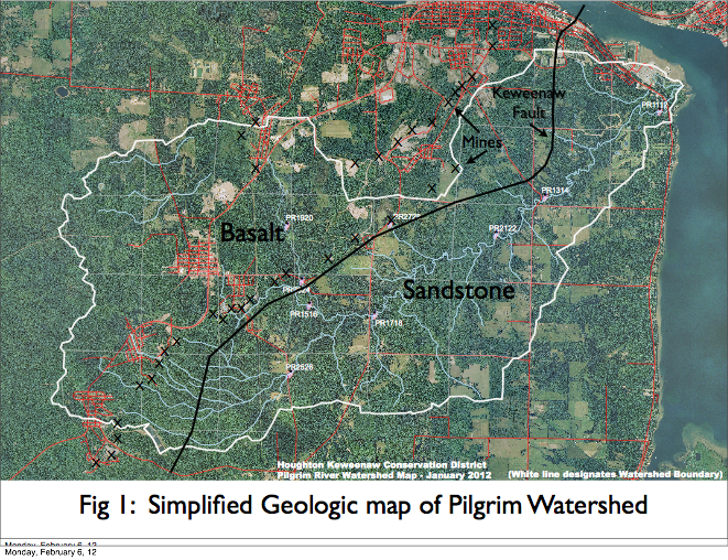 All of the rock below the watershed is likely older than 1 billion years. The Basalt is a sequence of up to about 400 lava flows, one on top of the other, all dipping to the Northwest at steep angles of 45 degrees or more (Fig 2). There are a few layers of conglomerates in the otherwise monotonous dark grey lava rock sequence. The lavas have mineralized flow tops (amygdaloids) which contain copper and a variety of colored minerals. The most highly mineralized layers are the sites of shafts and mines, many of which are plotted in Figure 1. The shafts have mine dumps where mineralized waste rock has been piled. In many cases these waste piles have now been removed for construction use. The mine waste has only minor environmental impact because the minerals do not produce highly toxic or acid drainage. The south side of the watershed is made up of fewer and shorter tributaries which flow to the Pilgrim over very low slopes, while the north side is steeper and marked by more and longer streams. The south part of the watershed is underlain by sandstone and the north by basalt. The geochemistry of the two rock types and their porosity permeability contrasts are marked. The Jacobsville sandstone is a porous aquifer, marked by sulfide minerals and uranium occurrences. The Basalts of the Portage Lake Volcanics are relatively impermeable, and have geochemical signatures which mimic the copper deposits. The sandstone layers are nearly horizontal, probably dipping a few degrees to the south, while the basalts dip steeply N (Fig 2). The distinct differences of the two sides of the watershed and its relatively undisturbed environmental condition and location near the university make it advantageous for geoenvironmental watershed research.