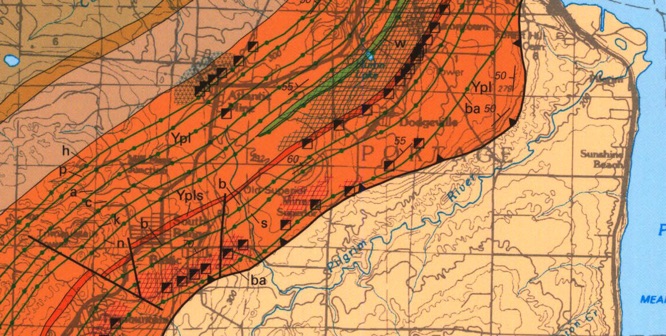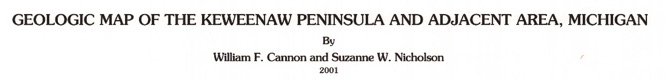 The surface location of the Keweenaw Fault bends from Nearly N-S to WSW south of Houghton near the Paradise Road, making a shape that is convex to the SE. This bend restricts the movement of faulted material and must have squeezed and fractured it more with each quake event. This geometry could result in focus or restriction of fluid movement.