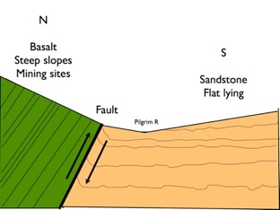 The soil and ground conditions change in other ways too. There is much more water in the ground at and below the fault. Seeps are common near the fault and the first 100 meters or so below the fault is often wetter. Clay-rich material may be found right along the fault at the surface (likely a fault gouge). Landowners have learned that well sitings drilled just upslope from the fault can yield plentiful flow when they start in basalt, cross the fault gouge (aquiclude) and penetrate the Jacobsville below (aquifer). Well sites too far north or west from the Fault don’t flow because they do not intersect this favorable geometry.