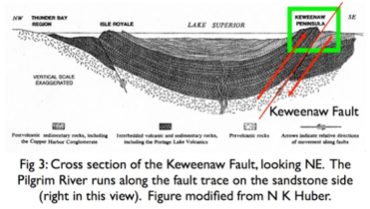 Then, approximately 1.04-1.08 billion years ago, the landscape changed dramatically due to a plate collision along the Grenville tectonic zone. Because of the enormous compressional pressure created along the Keweenaw Peninsula, the rock bed was forced upward in a thrust fault. The force from the compressional action tilted the igneous rock bed, and offset the rock layers by as much as 3-5 kilometers. When this happened, the older layers of basalt were uplifted high above the surrounding sedimentary layers and left dipping toward the northwest.