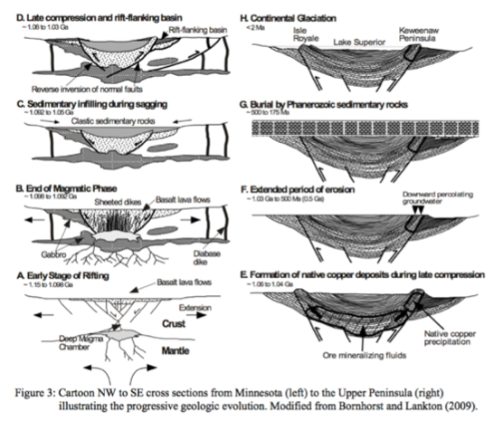 Approximately 1.1 billion years ago, the Keweenaw was a place of active lava flows. These lava flows were created by a stage of rifting. The enormous weight of repeated lava flows and rifting caused the rock bed to sink, or sag. As the surrounding rock eroded away, it began to fill in where the sagging occurred. The older, igneous rock (basalt) was buried by younger sedimentary rock (conglomerate).