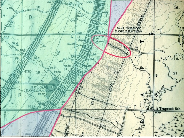 Sketch map of the Natural wall valley, showing the changes in the strike and dip of the Jacobsville beds as one approaches the Fault. Between the Wall and the fault beds are actually overturned. Visiting the natural wall is possible by a short walk from the Old Colony road to an overlook point where the wall can be seen from the opposite (E side) of the ravine, or by following the railroad grade until you encounter the creek bed and walking up the Creek bed to the Fault. This is private land--ask in the next house located W of the Parking Spot, along the road.