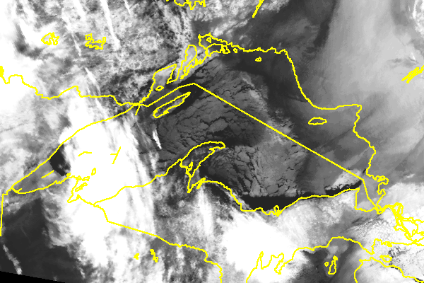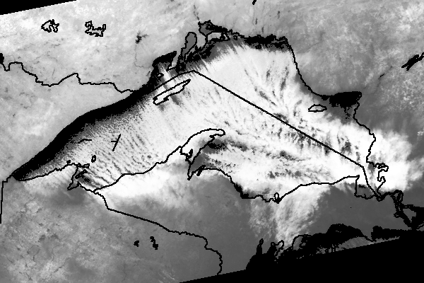 The amount of ice cover on Lake Superior directly effects the amount of lake effect snow we receive. In this image from March 2, 1994, the extent of the lake ice can be seen. It appears as a medium grey tone in this image. Cracks in the ice and (or) open water are dark tones. High clouds are bright white, while low clouds are grey (as seen over the eastern shore).