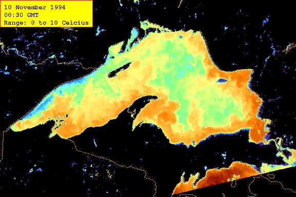The AVHRR sensor can be used to determine surface water temperature. In this image from November 10, 1994, only the data values from 0 to 10 degrees Celsius are shown. Blue is cold and dark red is warm.