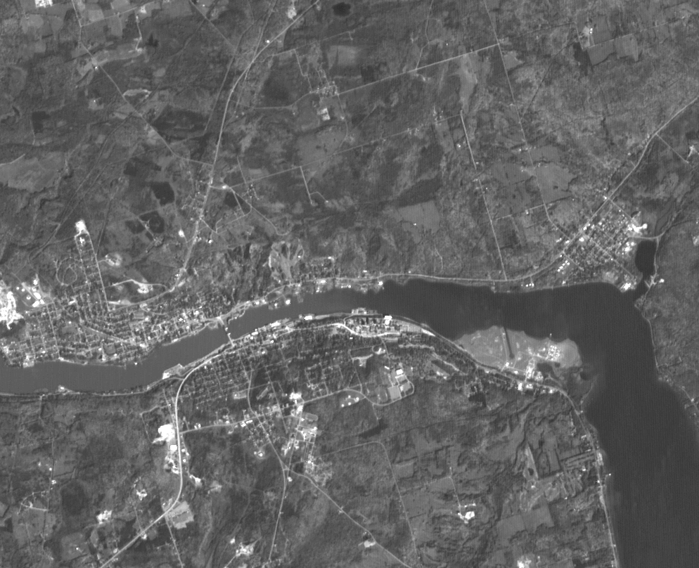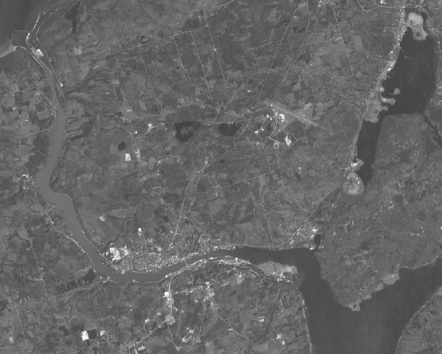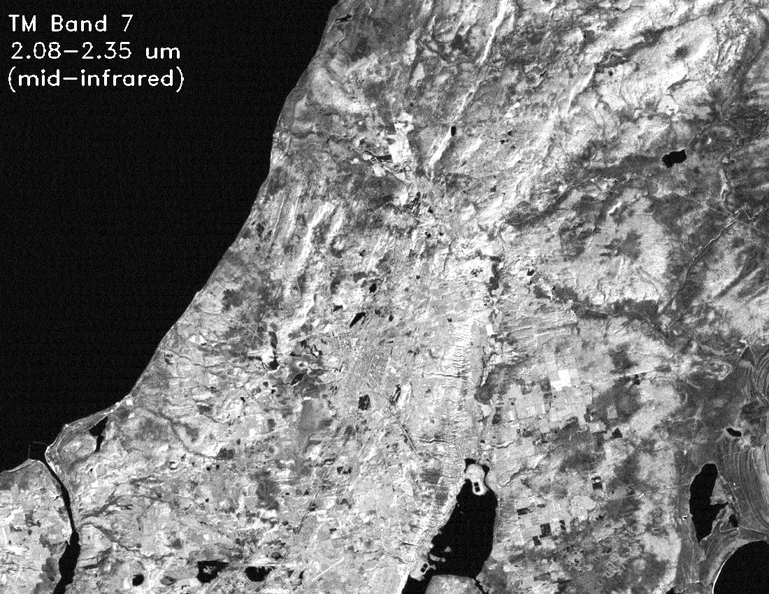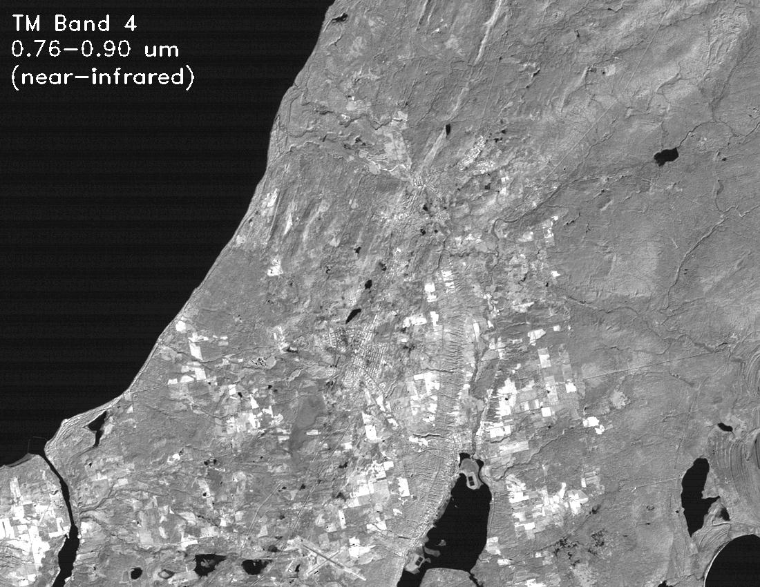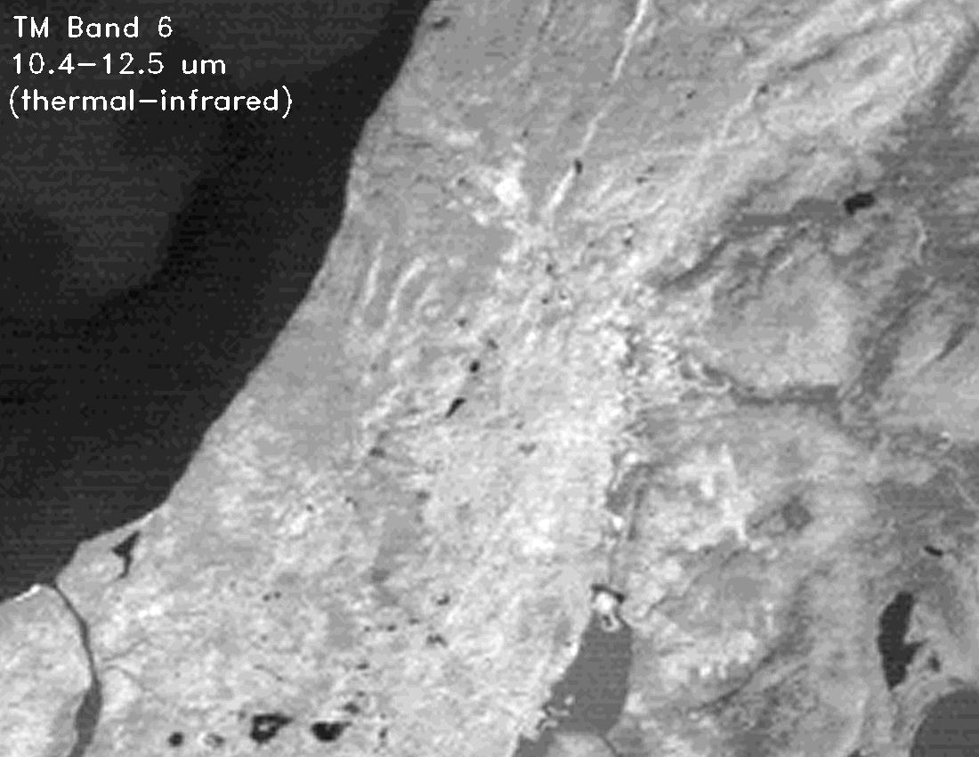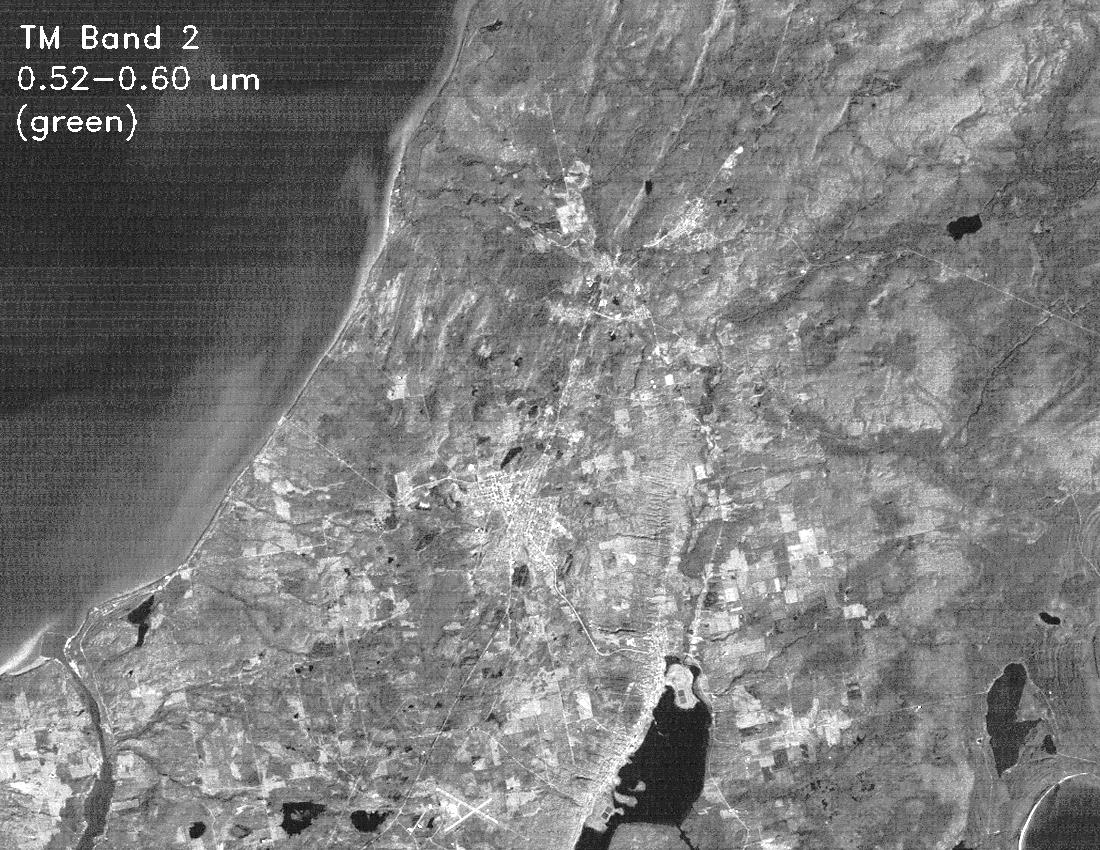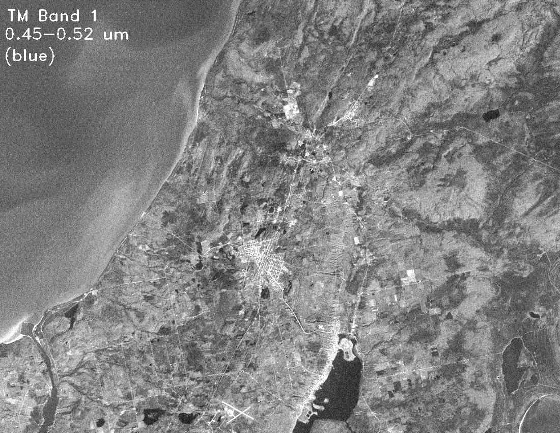 The images on this page were collected by the Landsat Thematic Mapper (TM) sensor and by the Spot Panchromatic (PAN) sensor. The Landsat image was collected in October 1986, while the Spot image is from September 1991.