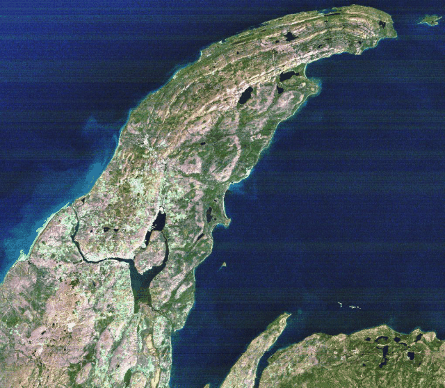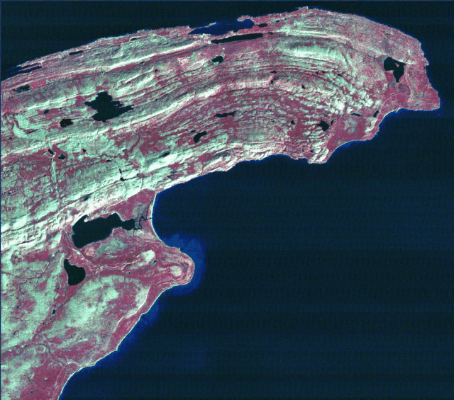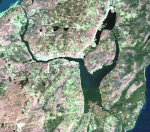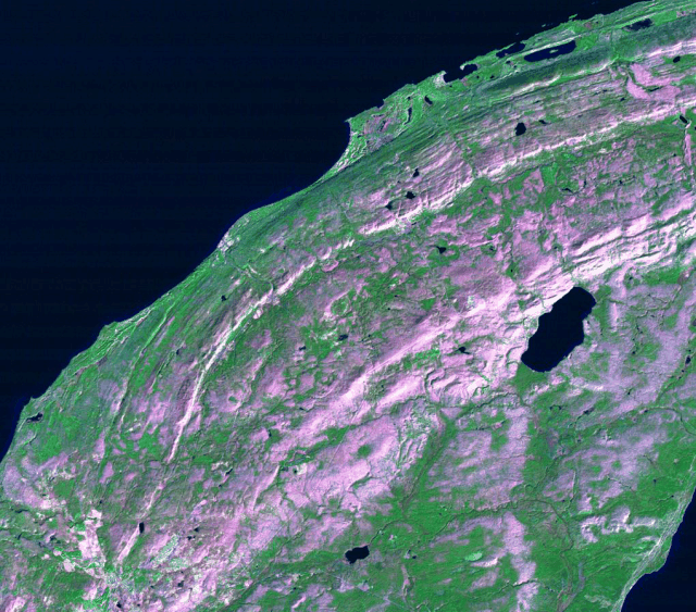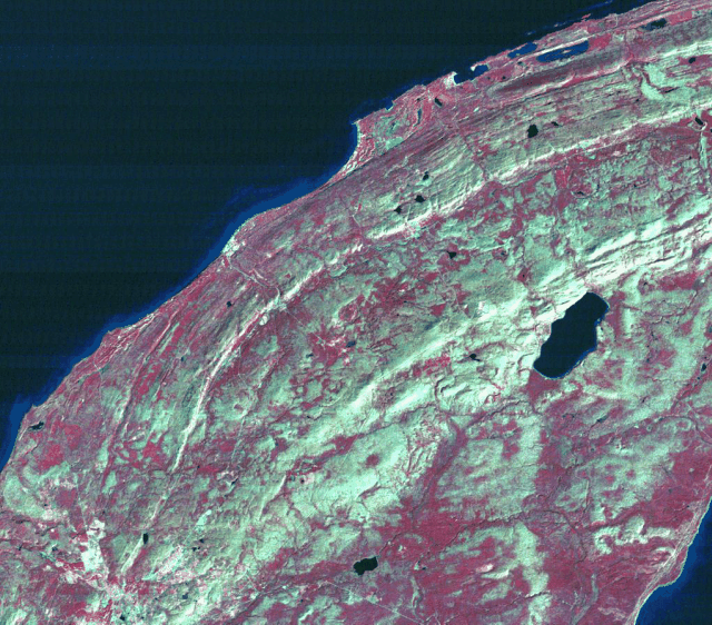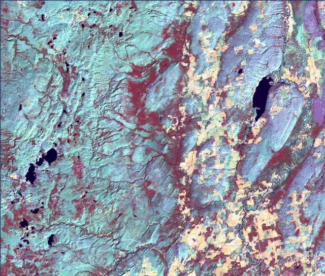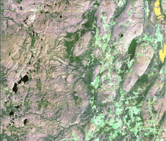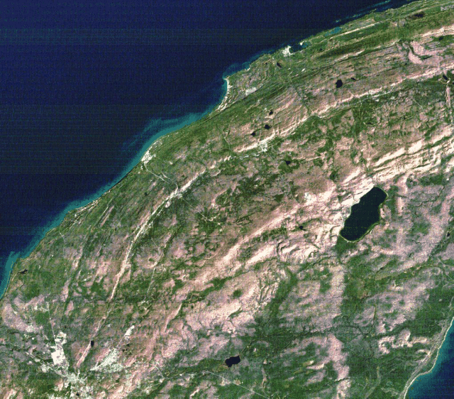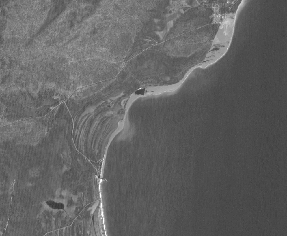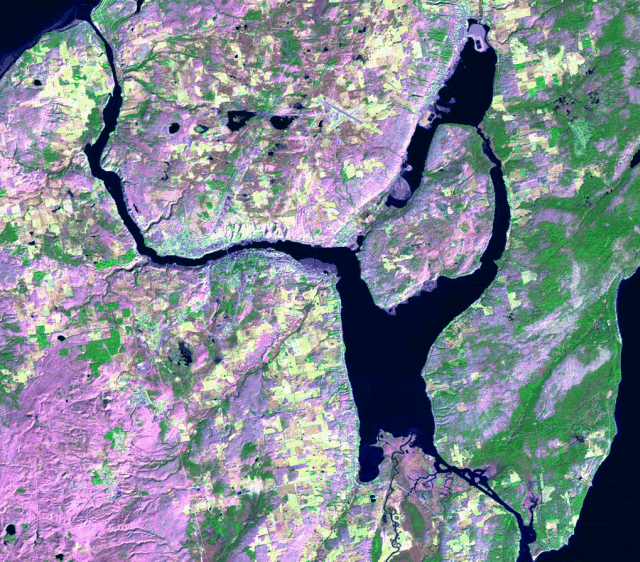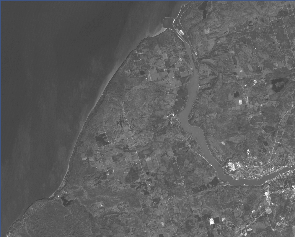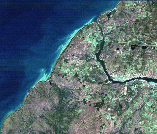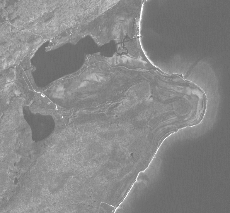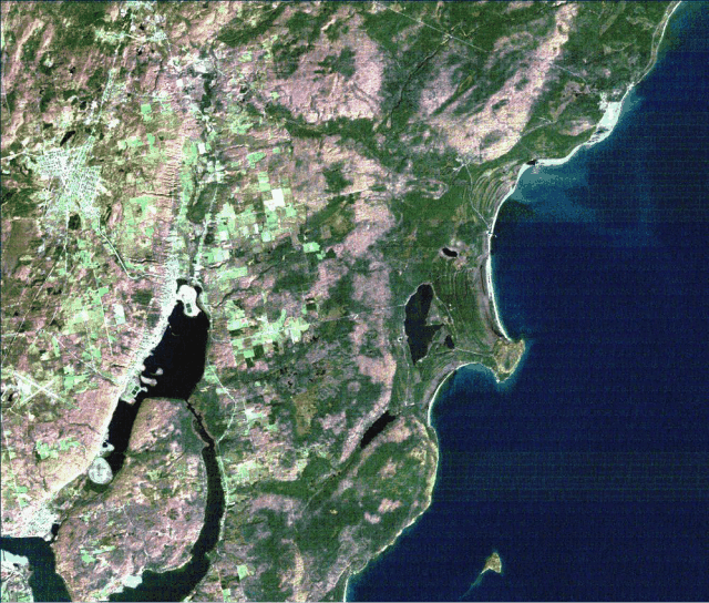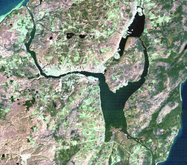The images on this page were collected by the Landsat Thematic Mapper (TM) sensor and by the Spot Panchromatic (PAN) sensor. The Landsat image was collected in October 1986, while the Spot image is from September 1991.