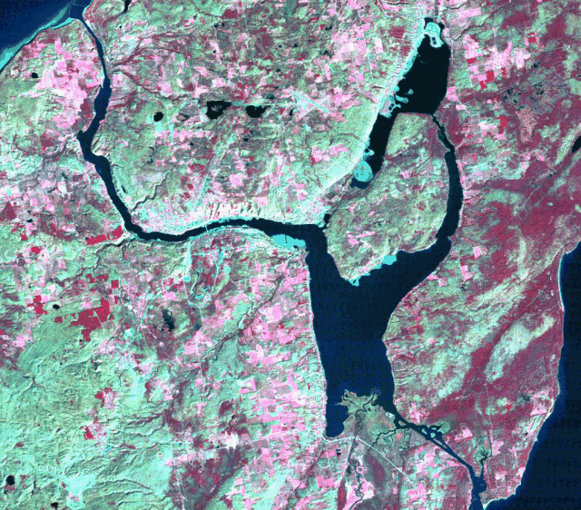 To produce a false color image , any of the bands can be put in any of the monitor color "guns". The band combination which is used can be changed to highlight the desired feature or phenomena. Here is an example of a false color composite , which was produced by putting TM band 5 in red, band 4 in green and band 3 in blue. The notation for this band combination is "543", and the images below use the same naming convention.