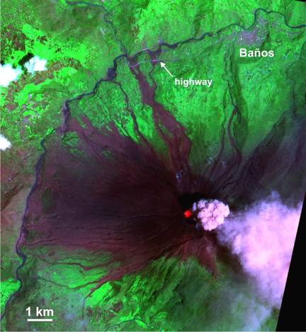 ASTER Image from Terra satellite, bands 9,3,1. Tungurahua Volcano in Ecuador from October 16,2006. (by Matt Patrick and Nicholas J. Smith, data from EOS)