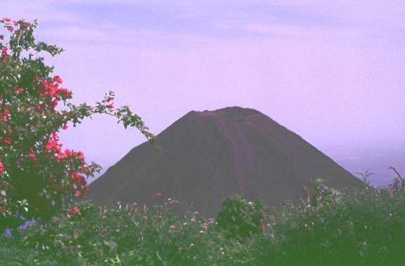 - Izalco as seen from the "mirador" of the Hotel de la Montaņa in the Cerro Verde National Park. Note the trail going straight up the flank of the volcano. Photo by Carlos Pullinger, 1994.