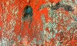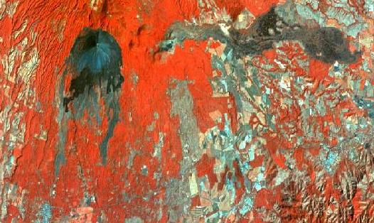 The above image is a LANDSAT image (1986) of bands 2,3 and 4. Izalco volcano can be seen as the grey to black structure. The lava flow at the right of Izalco is from the 1722 eruption of San Marcelino volcano. Izalco is a parasitic cone that is 4 km south and seaward from Santa Ana volcano's central crater (Carr and Pontier, 1981) and is part of the Central American volcanic chain This chain is a result of the convergence of the Cocos and the Caribbean plates. Carr et al. (1982) note that "the volcanic front is divided into eight segments, separated by zones of transverse faulting and offsets and changes in strike and dip of the seismic zone. The active volcanoes, most of which are probably younger than 100ka, were preceded by an earlier Quaternary volcanic front, and by several pulses of volcanic activity during the Tertiary.