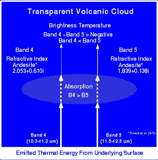For transparent volcanic clouds, the absorption of energy from the underlying surface is greater in the band 4 region than the band 5 region, due to a larger refractive index for silicates in the band 4 region than in the band 5 region. This results in a negative band 4 minus 5 brightness temperature difference.