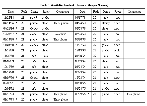 Volcanoes are typically in environments with strong characteristics. The shape of the volcano itself leaves a strong imprint on its local weather and topography. Santa María is in a highland tropical winter dry season climate regime, and is characterized by frequent fog. The mean annual temperature is about 15 C and does not vary much from month to month. The temperatures range from a maximum of about 35 C at noontime at low elevations south of the volcano to about 0-5 C at the summit of Santa María at dawn. The mean annual rainfall is about 4 m on the south flank near Santiaguito, with nearly all of it coming between April and October. Rainfall is much less (approx. 2 m) on the north flank of Santa María. The cloudiness and fog have a regular pattern which builds up clouds each day as solar energy heats the land surface. On many days, and particularly in the dry season (November-April) the atmosphere is cloud-free in the early morning. This is a fortunate fact given the morning overflight time (945 am equator, ascending orbit) of the LANDSAT TM, because in spite of the tropical wet location there are an abundance of cloud free TM images (table 1). The advantages of the AM overflight will be maintained by the EOS-AM1 satellite platform, because its orbits over Santa María (1030 am equator crossing, descending orbit) will put it over the volcano at about the same local time (1000 am). The EOS-PM1 will be far less favorable, with an equator crossing at 1330 local time, when conditions are nearly always cloudy.